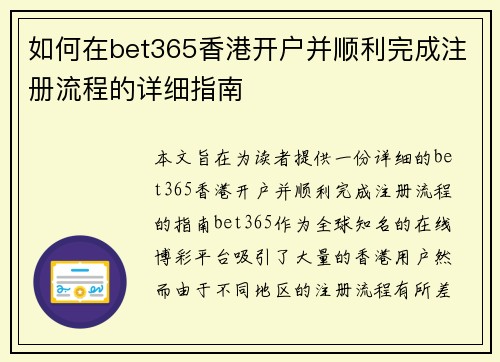 本文旨在为读者提供一份详细的bet365香港开户并顺利完成注册流程的指南。bet365作为全球知名的在线博彩平台,吸引了大量的香港用户。然而,由于不同地区的注册流程有所差异,特别是在香港,用户常常在开户时遇到一些技术性和合规性的问题。因此,本文将从四个关键方面详细阐述如何在bet365香港注册账户,确保您能够顺利完成开户,并快速开始您的投注之旅。首先,我们会介绍如何访问bet365网站并进行注册,接着说明如何填写相关信息和上传所需文件,然后探讨如何完成账户验证,最后总结如何确保账户安全及常见问题解决方案。通过这些细致的步骤,您将能够轻松完成在bet365香港的注册流程。